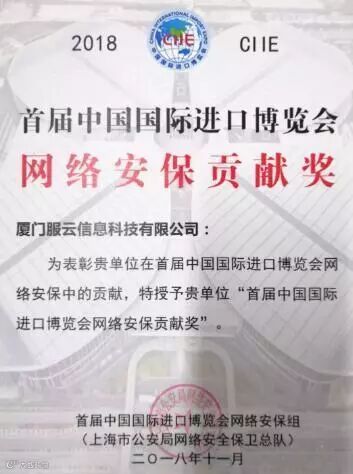 2018年11月5日至11月10日,首届中国国际进口博览会在上海国家会展中心隆重举办。安全狗派出了精干的技术支持队伍,圆满完成了网络安全保障任务,并获得了表彰。