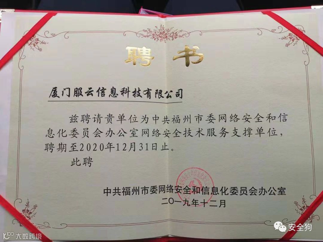12月20日,福州市委网信办举办了首批网络安全技术支撑单位聘书颁发仪式。安全狗作为拥有技术优势的网络安全企业,入选了福州市网信办网络安全技术服务支撑单位!