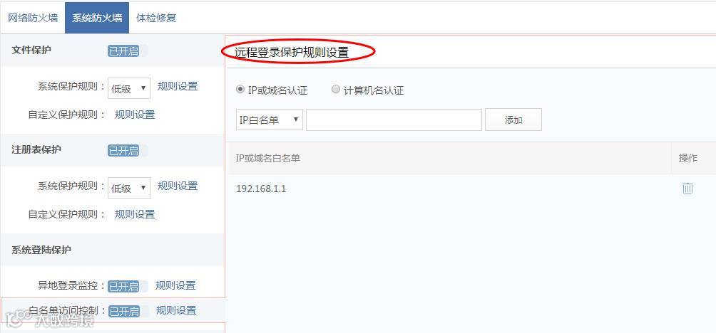 (【服务器安全防护】-【系统防火墙】-【系统登录保护】-【白名单访问控制】-【远程登录保护规则设置】)如下图所示