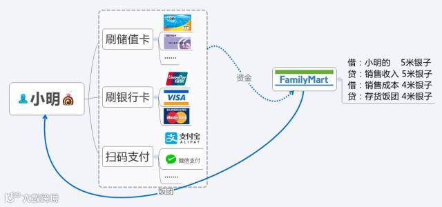 最容易想到的,当然是资金的变动咯。最简单的场景,小明在全家买了个饭团饱腹,简单起见,假设花了5米银子,用的呢,是马叔叔的支付宝。假设饭团立马顺利进了小明的肚子(先不考虑退货退款流程),那显然这钱呢,是从小明的银行账户,跑到了全家的账户。