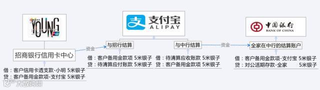 场景2:小明通过招行信用卡刷卡支付,全家的结算账户依然在中行。