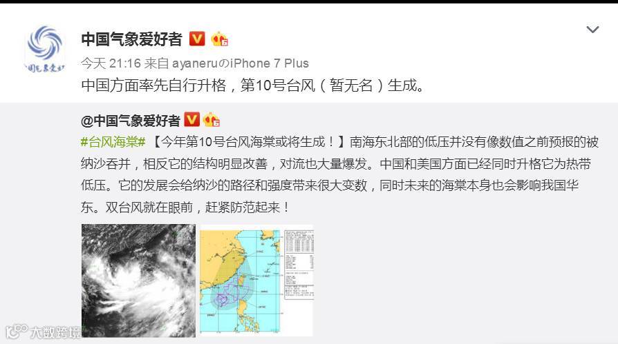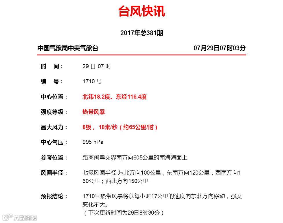 @中央气象台:南海热带低压已于昨天晚上加强为今年第10号台风(暂无名),今天早晨7点钟其中心位于闽粤交界处南方向605公里的南海海面上,就是北纬18.2度、东经116.4度,中心附近最大风力有8级(18米/秒),中心最低气压为995百帕,七级风圈半径100-150公里。