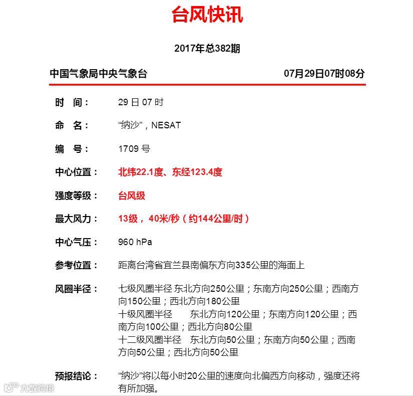 @中央气象台:今年第9号台风“纳沙”已于28日17时由强热带风暴级加强为台风级,29日07时其中心位于距离台湾省宜兰县南偏东方向335公里的海面上(北纬22.1度、东经123.4度),中心附近最大风力13级,中心最低气压960百帕。