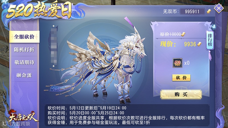 正如520热爱日的主题“我是热爱分之一”。当个体会发光,热爱有你才完整,当每一个玩家的热爱汇聚起来,我们的游戏世界就会更加有趣奇妙。在5月20日这个每美妙的日子,无双世界中的好战少侠们将可以参与一场席卷天下的全服砍价活动。人人都来贡献挥出砍价一刀,价值高达上万元宝的“兰宝基尼马”劲爆拉风坐骑,将在玩家们用力砍呀砍面前应声跳水直落底价跌停板。