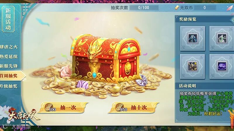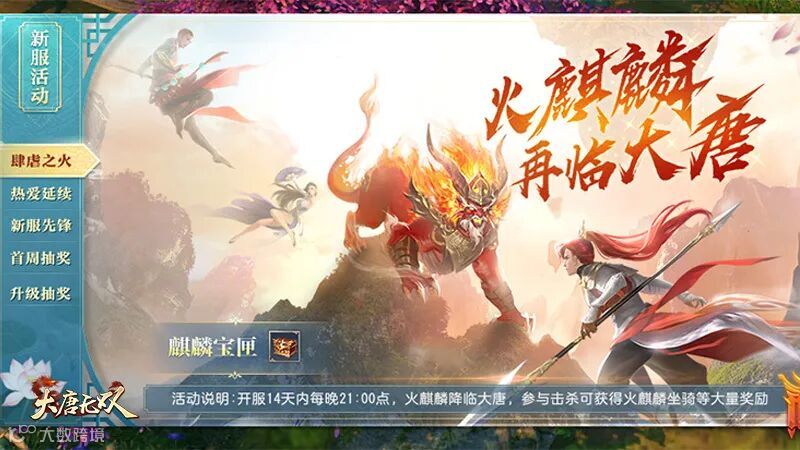 在新服开启之后14天内,“肆虐之火”活动将席卷而来。炎炎夏日,“火麒麟”世界BOSS再临无双世界,少侠们唯有在晚间亥时(21时)天气凉爽之时方能寻获“火麒麟”的身影。集合群英之力群战“火麒麟”,在经过一番惊动天地的恶斗获胜后,所有参与战斗的少侠都将获得“麒麟宝匣”作为奖励,搭配上一点好运气,宝匣可是有机会获得火麒麟坐骑等超值奖励。此外,欧皇们还要留意新服首周的限时抽奖,每天100次抽奖,连续7天,如此大量的奖励错过了可是会悔青肠子的。