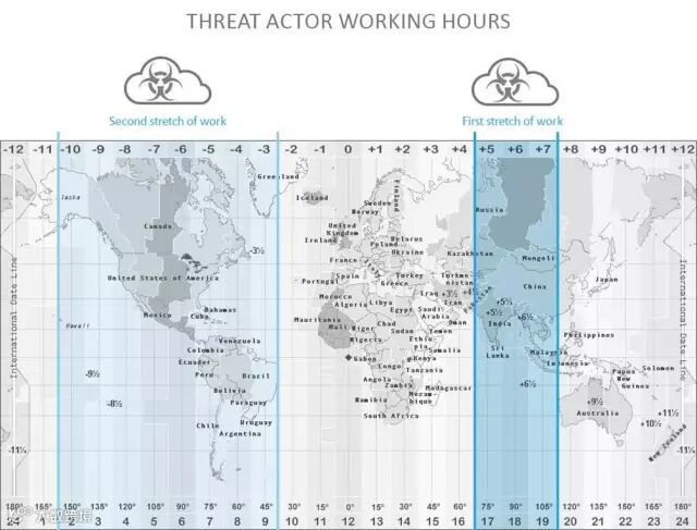 C&C服务器的活动不仅在于单独的几个小时之间,还在于每周的每天,通过对每天的时间区间进行描述之后,我们可以发现不同的模式,例如,每周的周日活动较多,周六较少。另外,攻击活动不早于凌晨2点,不晚于上午11点,除了某个周日之外。“攻击工作时间”图如下: