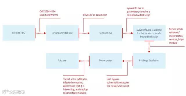 攻击载体是一个以PPS为附件的网络钓鱼邮件,嵌入漏洞 CVE-2014-4114 的利用代码。漏洞利用代码执行之后释放可执行文件和Windows驱动程序描述文件INF。