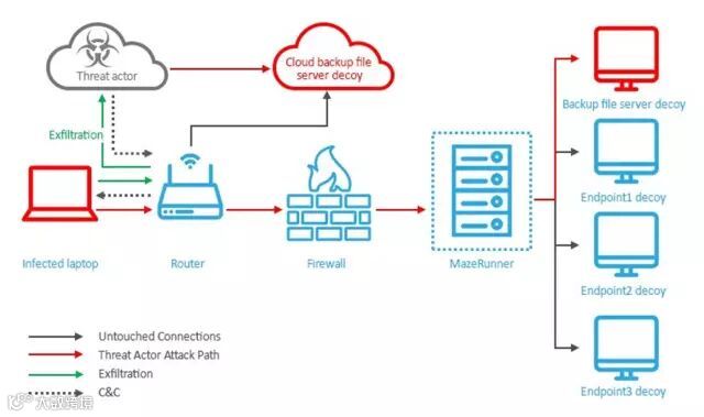 零星的诱饵数据可以让攻击者向另一主机转移,这些数据可以是存储凭据,共享文件夹、浏览器cookies,VPN配置等其它信息。最终我们利用了Cymmetria’s MazeRunner 系统成功捕获了攻击者的活动。