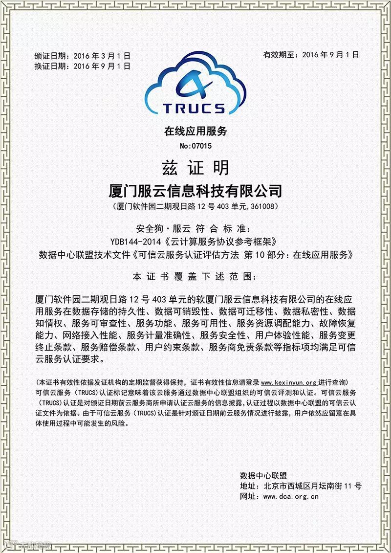 “可信云”认证是目前国内对云服务商服务能力、安全程度的的一个权威认可,是目前云服务客户采购云计算服务的可靠依据。2016年3月,数据联盟中心正式发布通过本批次认证的企业级SaaS认证云服务名单,安全狗是仅三个安全类名单成功获得的其中之一。而在此之前,通过该认证的有阿里云、腾讯云、金山云、360云等。
