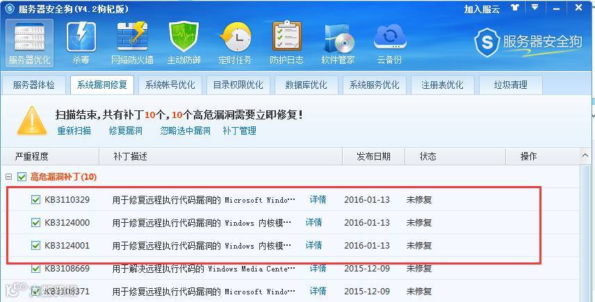 微软发布2016年1月安全公告,此次漏洞涉及InternetExplorer浏览器、Windows系统组件、Office软件,攻击者利用漏洞可以实现远程入侵。服务器安全狗已第一时间推送安全更新,请及时修复安全狗提示给您的系统高危漏洞,避免漏洞被利用遭到攻击。