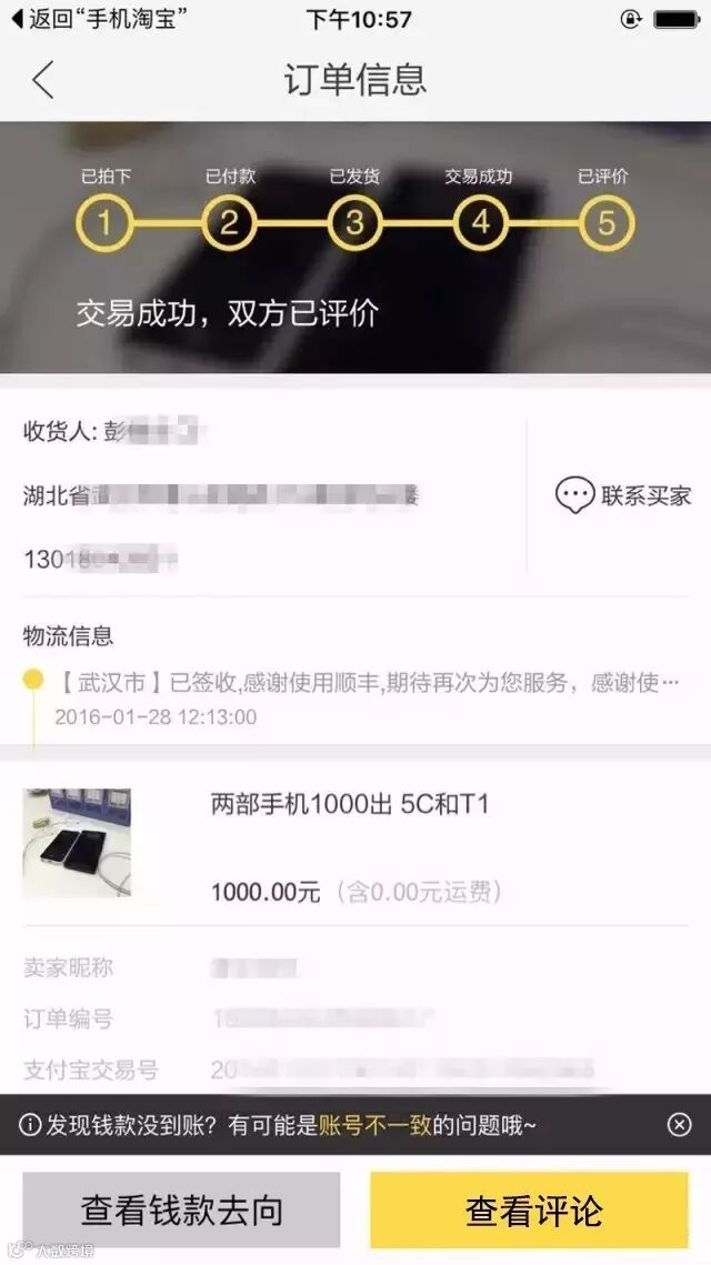 在和支付宝客服沟通过程中,对方询问“聂小刚”是否使用过一台锤子手机。“聂小刚”回忆,他之前确实换过手机,现在一直使用iPhone 6S,之前的两部旧手机在1月28号那天,通过网络平台,以1000元的价格卖给了武汉的一位买家。