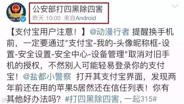 公安部治安管理局官方微博发布提醒,换手机前,一定要取消对旧手机的授权,不然别人可能轻易登录你的支付宝!