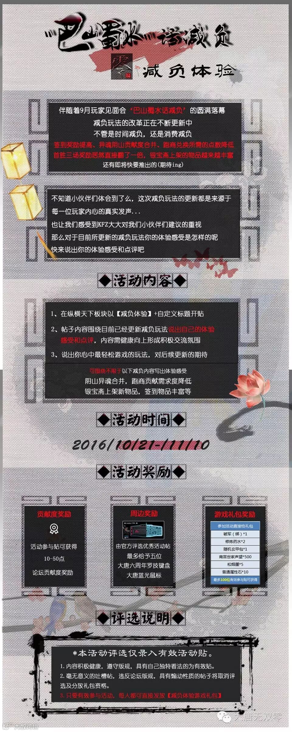 3、将有机会获得大唐限量周边,参与活动即可直接获得减负体验游戏礼包(由官方版主通过论坛短消息发送)