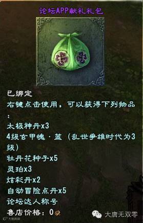 9月12日19点整,将在《大唐无双零》官方论坛APP中开始投放APP专属礼包