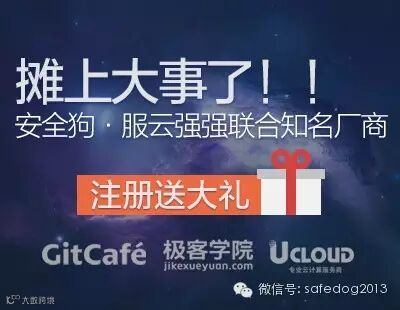 【注册服云,送豪礼】安全狗服云联合UCloud、Gitcafe、极客学院等知名厂商展开“注册送好礼”活动,即日起,凡是当日注册并激活成功的用户均能获得礼品一份,先到先得,领完为止! |
