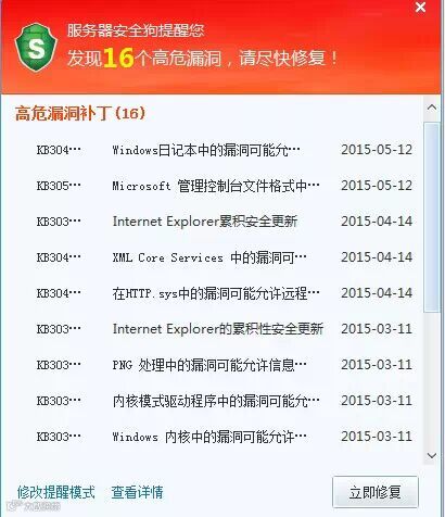 微软在补丁星期二发布了2015年5月的13个安全公告https://technet.microsoft.com/library/security/ms15-may, 其中包含3个“严重”级别和10个“重要”级别,主要修复了Microsoft Windows、Internet Explorer、Office、.NET Framework、Silverlight等组件中的安全漏洞。目前服务器安全狗已经第一时间推送了安全更新,安全狗建议及时修复提示给您的系统高危漏 洞,避免漏洞被利用遭到攻击。