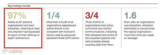 对于传统的安全解决方案来说,还存在着大量的单点防御问题。在去年五月,全球知名安全公司FireEye发布了一份名为《网络安全的最后防线:深度防御的实境评估》的研究报告。报告中,FireEye分析了全球1217家遭受安全攻击的企业,这些企业广泛部署了诸如防火墙、IPS、沙箱或防病毒产品,但仍有97%的企业仍被黑客成功入侵。