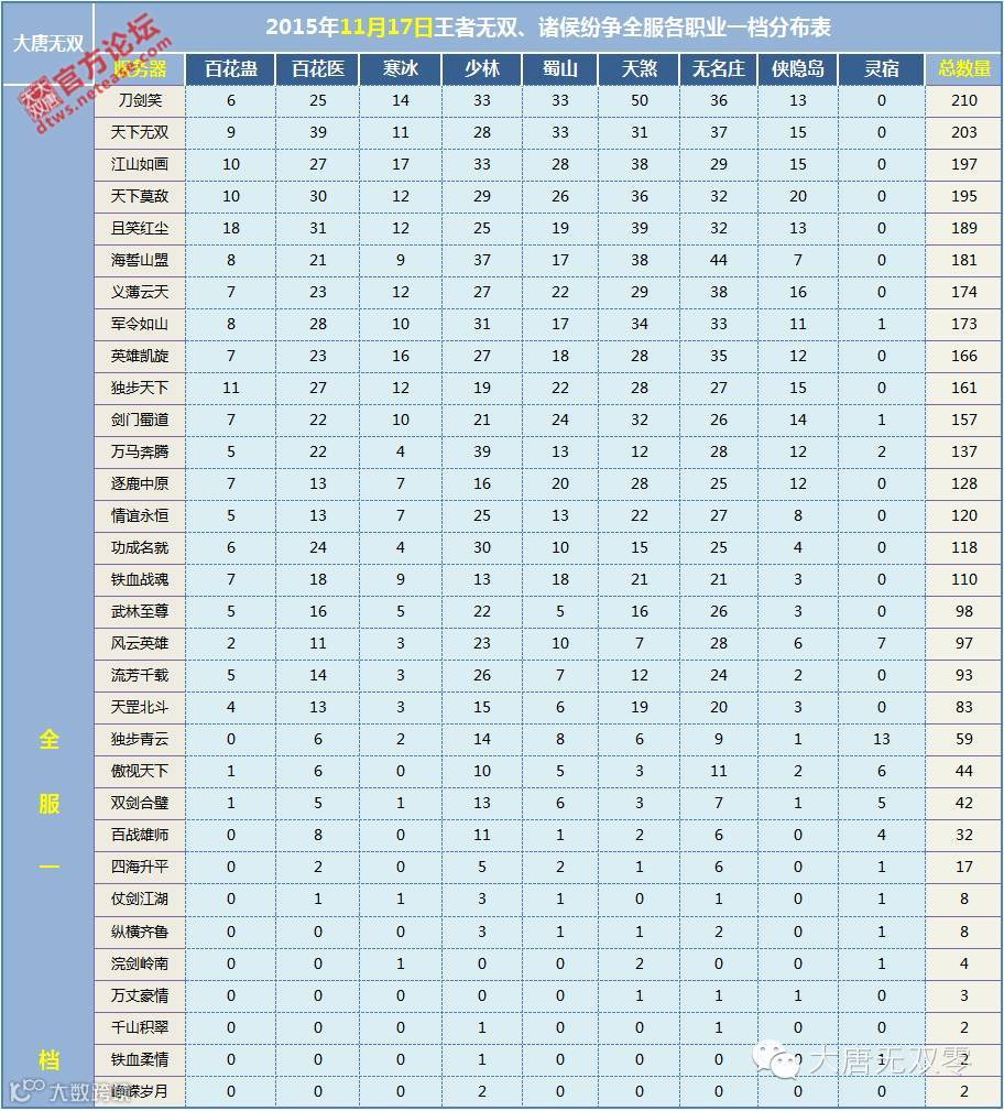 导读:【11月17日】王者、诸侯全服国力、一档、天策、转服分布表【11月17日】全服各职业一档分布表点击下方“阅读