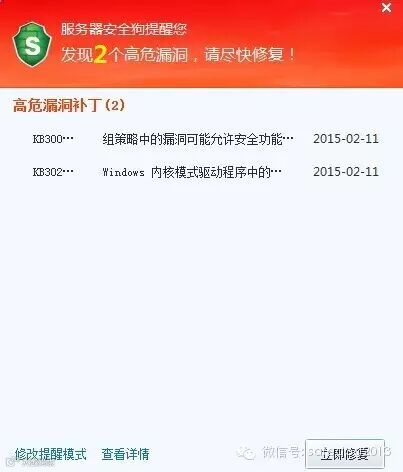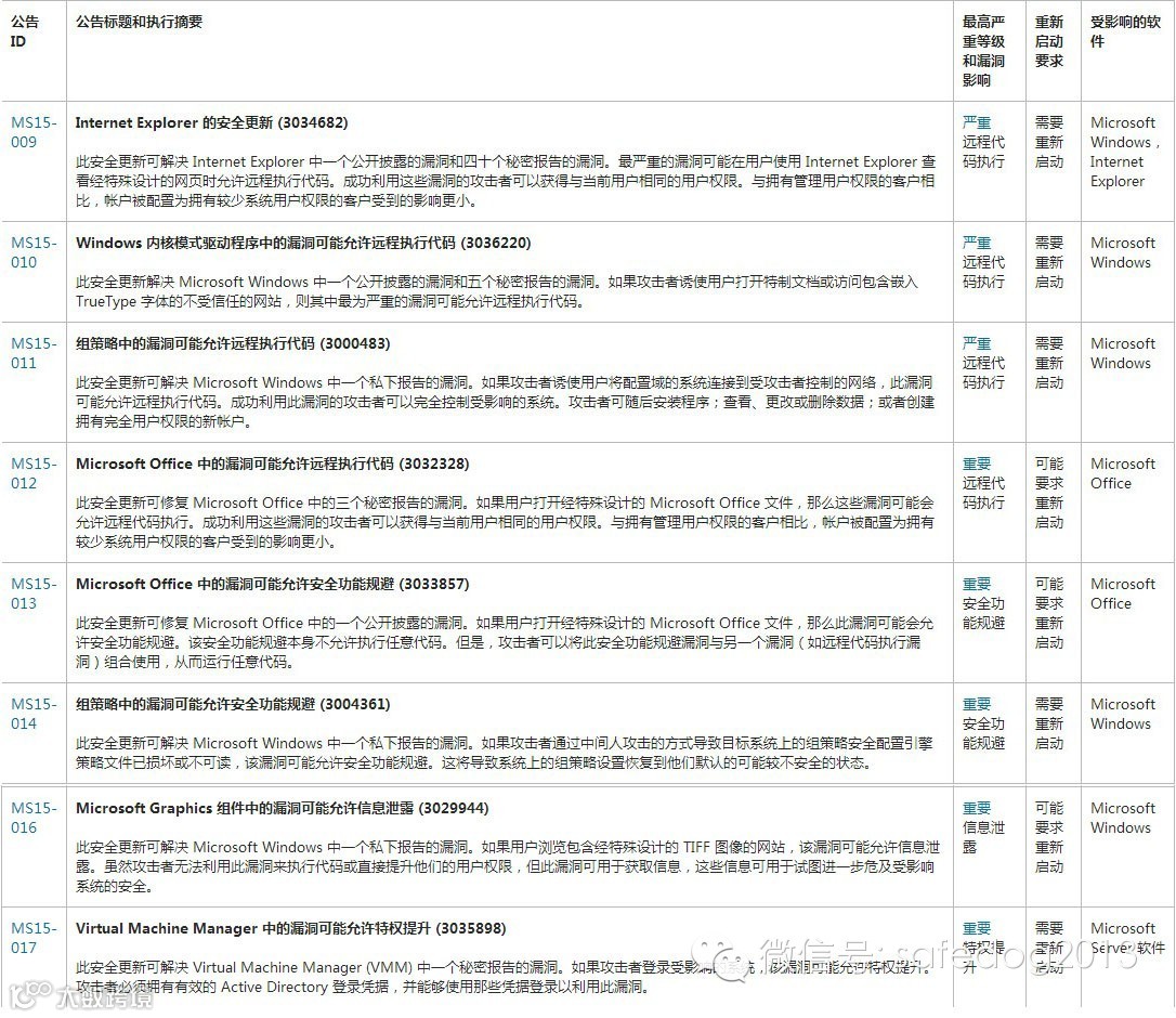 本月的补丁级别较高,建议用户及时更新修复啦。微软2015年2月安全公告:https://technet.microsoft.com/library/security/ms15-feb