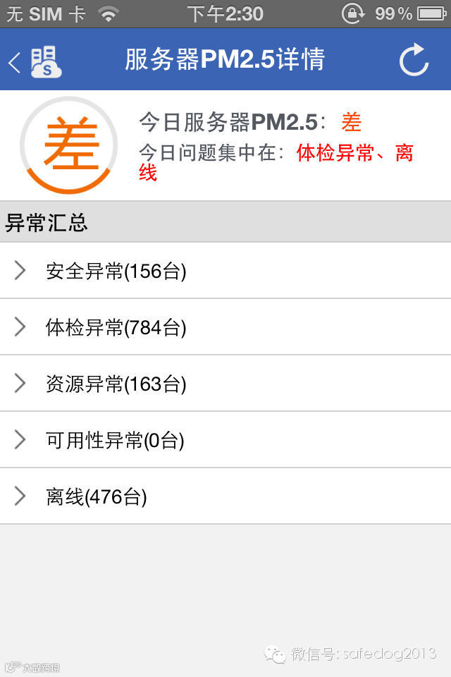 点击查看详情,即可进入详细页面了解今日所有服务器异常情况,包括:安全异常、体检异常、资源异常、可用性异常、服务器离线情况,如下图: