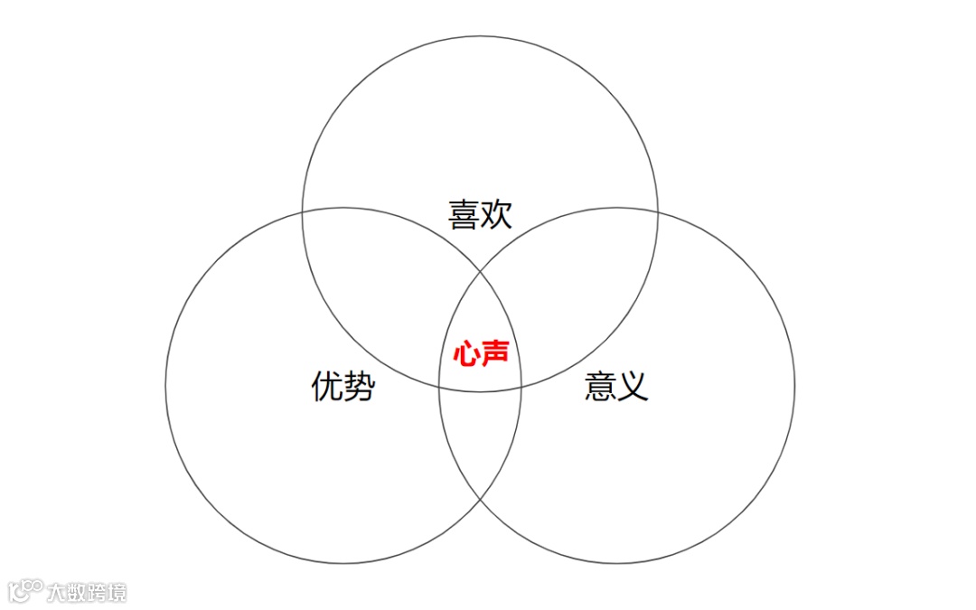 不知道从何探寻的,可以简单参考下面这个三环模型,在喜爱、优势与意义的三环中找到交叉点,那个集喜爱、优势与意义为一体的事就是你的心声所在。