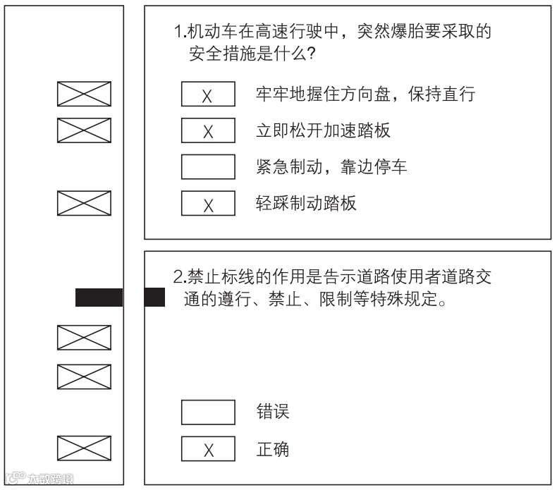 比如有下面这样一页德国考驾照的练习题,四道题目分布于一页纸的左右两侧。答题时,在每一题正确答案前的多选框里打 × 即可(德国人默认打 × 表示正确的选项)。