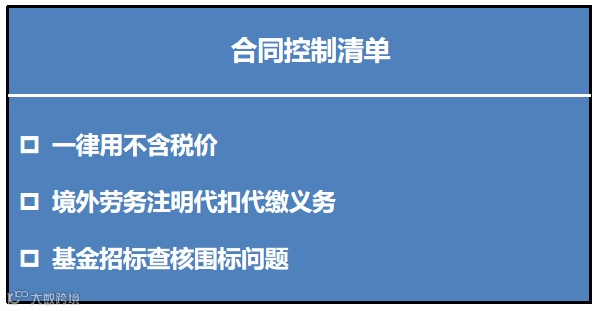 第2条,境外劳务,比如咨询公司的美国专家来做的软件服务咨询,由于是与境外机构签的约,支付时需要代扣代交预提所得税,100万的合同只能付给对方90万。结果起了争议,后来因为事先没有说明,各打五十大板,我们白白地多承担了5万税费。这里插一个细节,我们财务部发现采购部一直在为对方说情,让我们一度怀疑采购员是否有吃里扒外的猫腻。这种疑惑永远只是猜测,无法证实。但是通过一个透明的控制清单,可以丑话说在前面,避免不必要的猜疑。怎么样,一个好的财务可以通过职业化的手段,把一个道德问题简化成一个数学问题。