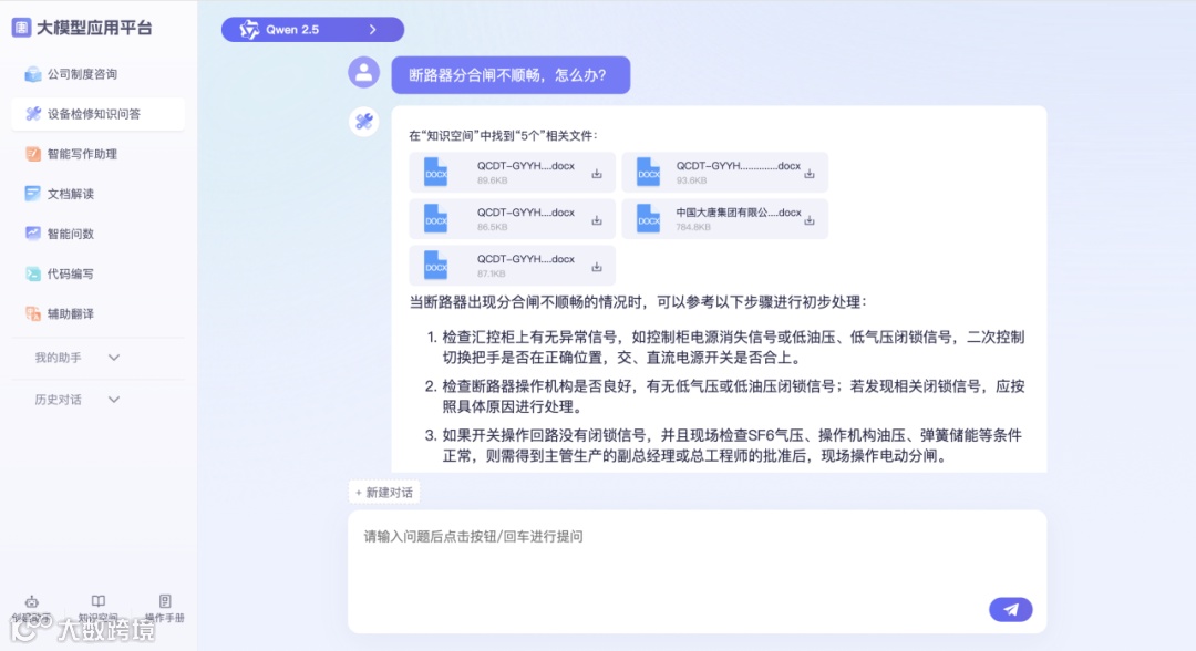 图为大模型应用平台“设备检修知识问答”界面