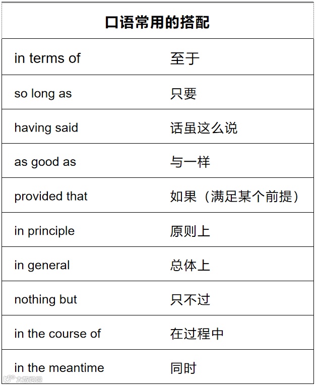 我有一个方法推荐给大家,就是加点润滑剂,掌握一些常用的套语,一些连接单词的固定搭配。这些套话练熟了,一下子一个完整的句子就出来了。比如,in terms of(至于),so long as(只要)等等。其实,常用的套语你把它列全了,不过二三十个,下面的图我截取了其中的一部分,大家不妨可以试一试,这些固定搭配练到脱口而出的时候,你的口语便会有一个飞跃。