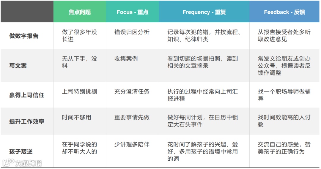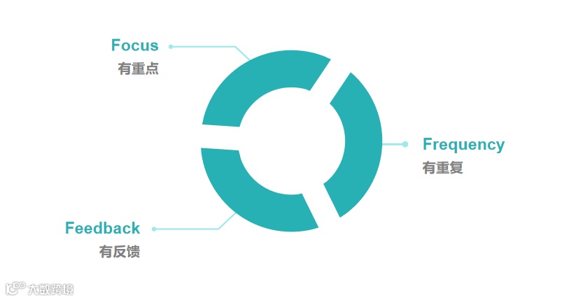 Focus,Frequency,Feedback,这三个F有点像管理学PDCA中的PDA,规划重点,反复练习,适时调整。这样,每次练习都会在昨天的基础上更上一个台阶。