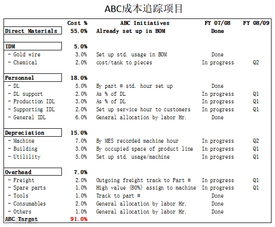 下面这张表,是我曾经供职过的一家半导体工厂的作业成本法实施架构图,经过一年的实施最终达到了直接追踪成本占总成本90%的目标: