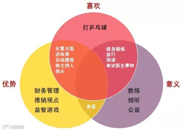 这个“喜欢”、“优势”和“意义”三环图,最值得关注的是三环交叉的中间部分,这是一个人既乐意去做,又觉得自己得心应手的领域,关键是,自己还特有成就感,这个交叉区域就是一个人的心声。人生目标迷失的时候,不妨做一下这个自测练习,找找自己的心声。