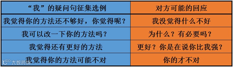 那该怎么说呢?我觉得换成一种“我”打头的疑问句比较有回旋余地。大家不妨自己做个测试,将“你的方法错了”改成“我”的疑问句,该怎么说?