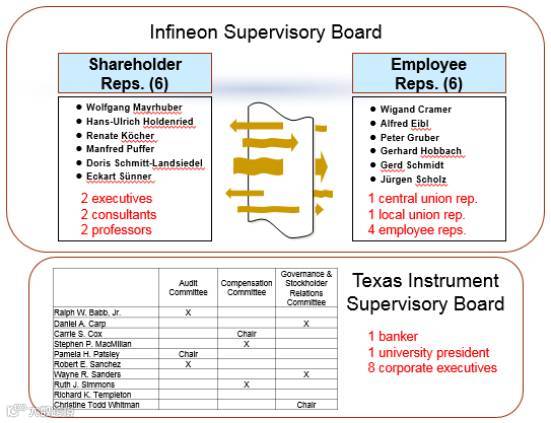 我从这两家公司的年报中摘取的信息做了这张比较图。这是两家公司的监事会构成,相当于国内的独立董事会。上面的是英飞凌的,共有12位监事代表,股东与员工代表各6个,可见员工在这家公司占有多大的分量。如果公司要做一个工厂向亚洲转移的战略决策,可想而知通过的可能有多大。
