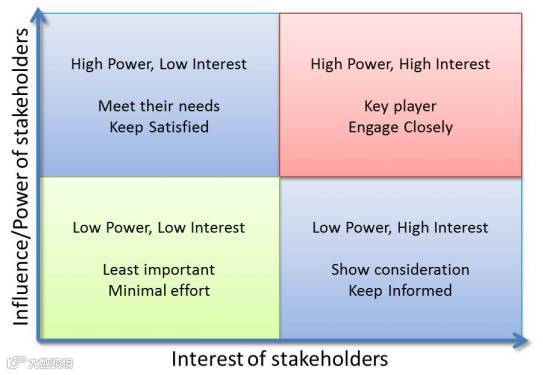 有一个Mendelow Matrix (曼德罗矩阵)专门阐述其中的利害关系。纵坐标是利益相关者的影响力大小,横坐标是利益相关者的兴趣大小。比如说员工一般都在第四象限:低影响力、高兴趣点。但从上面的对比例子看,因为英飞凌的监事会中员工代表达到半数,所以就上升到“高影响力、高兴趣点”的第二象限。