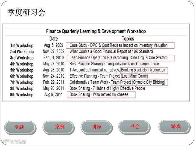 研习会就是通过专题、案例、讲座、书会、游戏等各种形式,实现做与思的互补性平衡。财务团队可以选择每个季度中间较空一个月的某天进行一次研习会,整理流程、挖掘改善空间、提升专项技能。