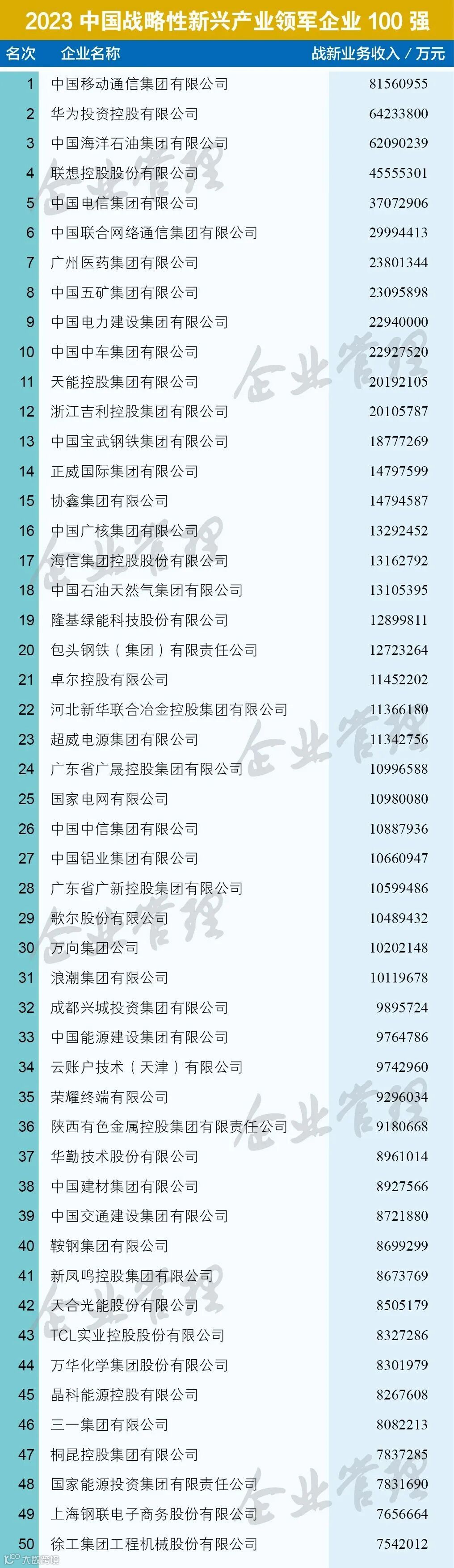 导读:2023年9月20日,中国企业联合会、中国企业家协会发布2023中国战略性新兴产业领军企业100强名单。