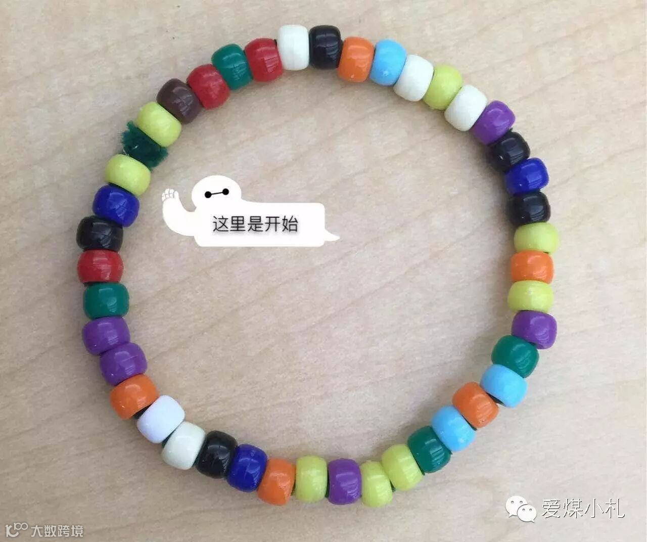 请注意这是暗藏玄机的,从大白手指标志处开始顺时针看:黄色是3,棕色是小数点,红色是1,绿色是4,浅黄色是5,紫色是8……小手串蕴藏大世界。