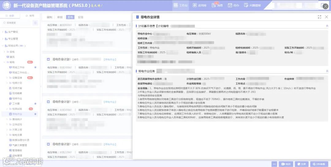 班组一线人员全面依托PMS3.0录入周、日作业计划、工作票及作业过程等全环节数据,实现了作业计划源头管控,一方录入、多方共享,有效解决基层多头维护问题,大大减轻了班组工作量,提高生产管理工作效率,切实做好生产作业“七分准备”。通过PMS3.0系统,班组能够更好地规划和协调无人机和小飞人的使用,确保智能检修装备的高效运作。