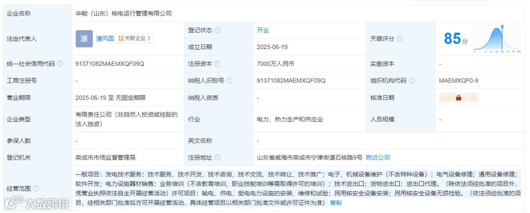 2025年6月,华能(山东)核电运行管理有限公司在山东威海成立。山东省威海市荣成市宁津街道石核路9号。