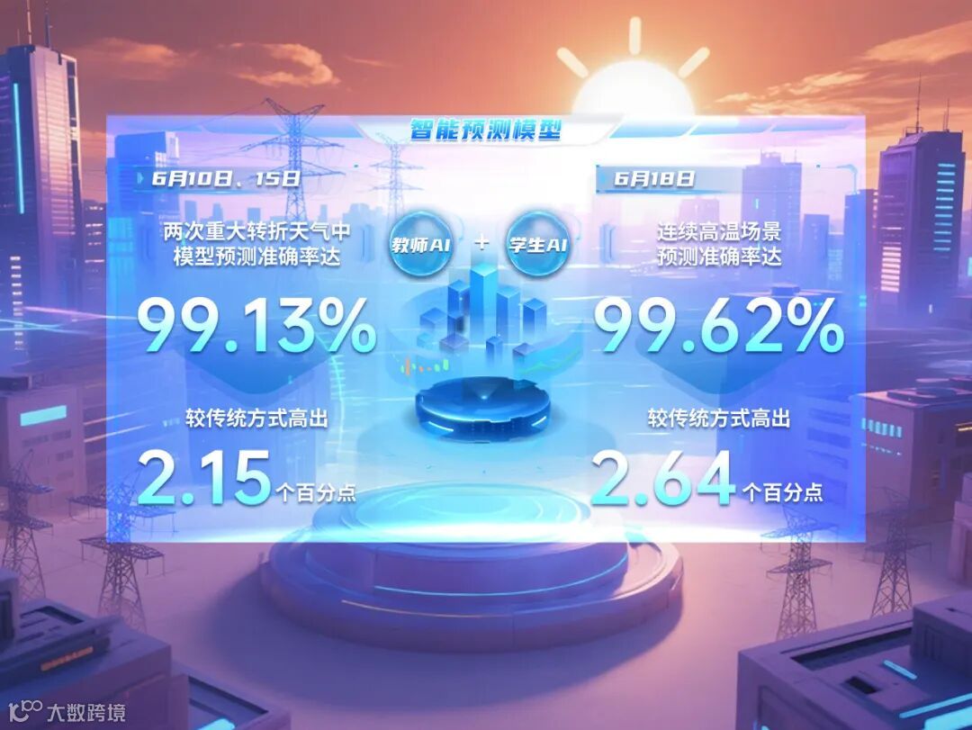“电网智慧大脑”创新构建“教师AI+学生AI”自学习迭代提升机制,建立了专业性强、可自学习、极端和转折天气适配性强的智能预测模型。今年入夏以来在6月10日、15日两次重大转折天气中模型预测准确率达99.13%,较传统方式高出2.15个百分点;18日连续高温场景预测准确率达99.62%,较传统方式高出2.64个百分点,在突破转折天气等场景的负荷预测精度提升瓶颈方面成效显著。
