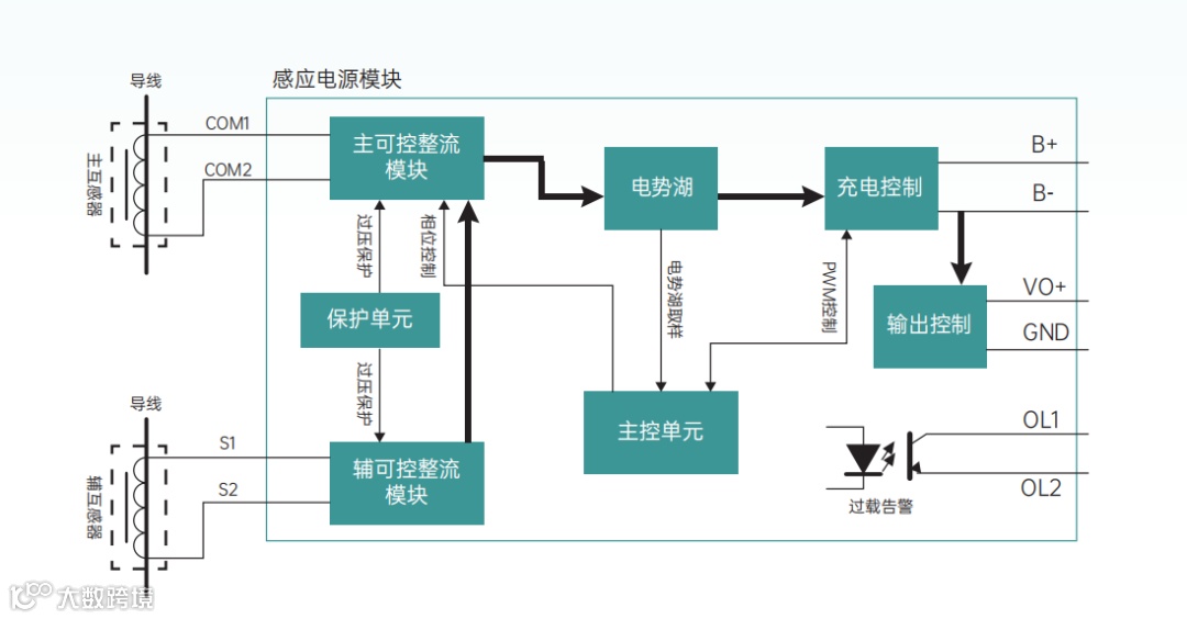 新型电流感应电源由取电互感器和感应电源模块两部分组成,取能互感器用于感应导线中的电流并转化为电压信号,感应电源模块将电压信号转换输出稳定的直流电源。奥博尔新型电流感应电源的取能互感器采用预制镜面半圆铁芯和精细化生产工艺,大幅度降低了铁芯切面气隙产生的磁阻,均匀分布绕组,漏磁更低,安全性更好,较同体积取能互感器电磁转换效率显著提升。