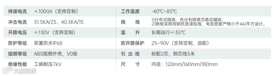 取电互感器采用IP68级防水、铁芯纳米层防锈及V0级阻燃设计,内置专业型开路保护器(保护启动后电压有效值Vrms<2V),大电流容量设计让额定满载电流时温升≤35℃,保障了现场的安全便捷安装及长期无忧的安全稳定运行。