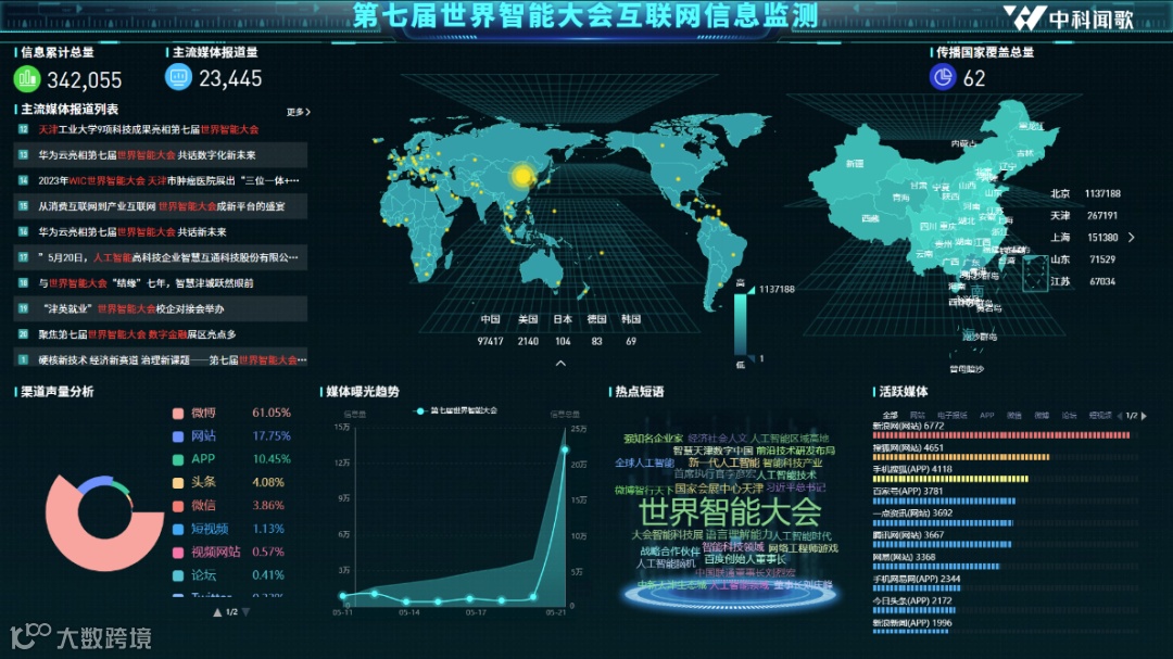 第七届世界智能大会首次采用大数据与人工智能技术智能化、数据化地监测传播数据,并以数据为指导实时监测舆情、调整传播策略。会后对传播数据进行深入分析,形成传播报告,为下届办会提供客观、科学的决策依据,实现“数智媒宣”,在智能办会上迈出卓有成效的一步。