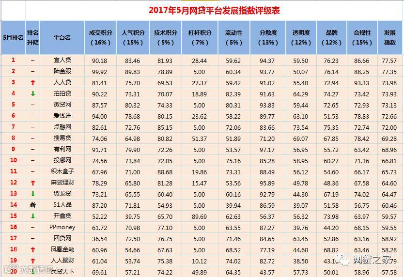 近日,国内知名P2P网贷行业门户网站“网贷之家”联合盈灿咨询对外发布了《2017年5月网贷平台发展指数评级》。评级报告显示,宜人贷、陆金服、人人贷、拍拍贷、微贷网、爱钱进、点融网、搜易贷、有利网、投哪网,发展指数排名前十。
