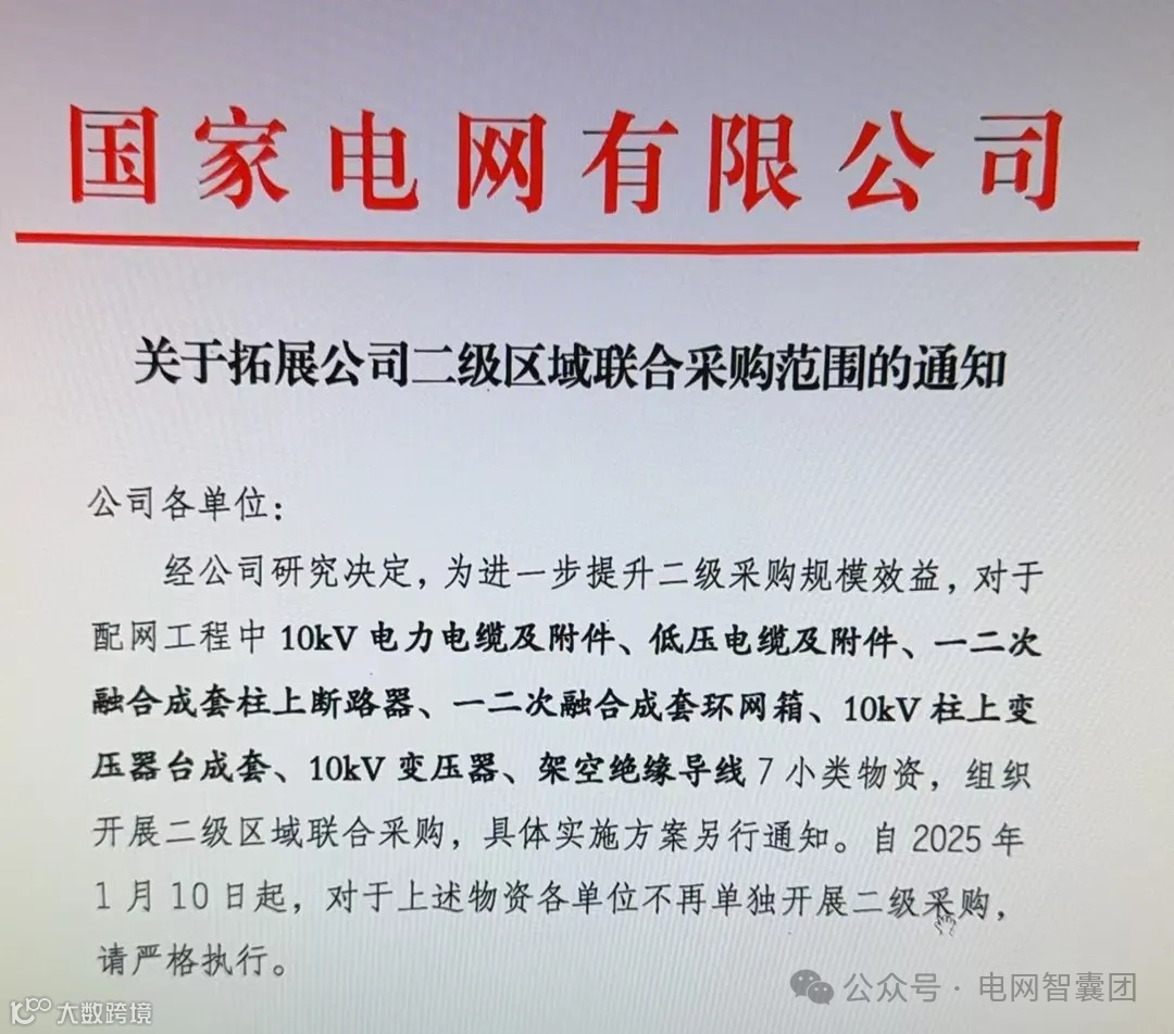 经公司研究决定,为进一步提升二级采购规模效益,对于配网工程中10kV电力电缆及附件、低压电缆及附件、一二次 融合成套柱上断路器、一二次融合成套环网箱、10kV柱上变 压器台成套、10kV变压器、架空绝缘导线7 小类物资,组织 开展二级区域联合采购,具体实施方案另行通知。自2025年 1月10日起,对于上述物资各单位不再单独开展二级采购,请严格执行。