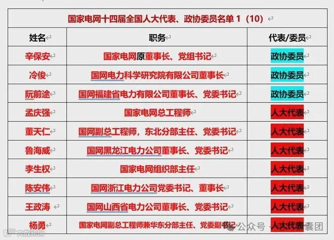 据初步统计,两大电网的代表、委员有23名,其中国家电网20名,南方电网3名。辛保安已于2024年两会后不久退休,现职为全球能源互联网发展合作组织主席,并任第十四届全国政协委员、人口资源环境委员会委员。南方电网董事长孟振平为十四届全国政协委员。