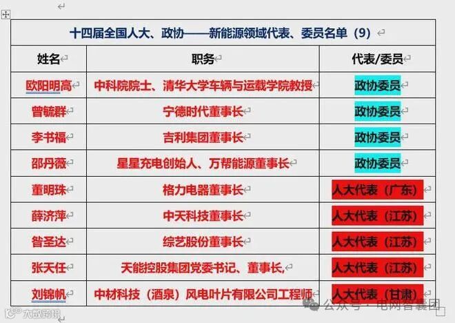 据计算,国家电网、南方电网“两网”及电力“八大金刚”的代表、委员人数达到49人。加上中国能建、中国电建、中国安能、中国电子、中国电气装备集团、东方电气集团、哈电集团、国机集团和贵州能源集团等电力相关企业代表、委员人数13位,光伏界10名代表、委员,总计达到72位。