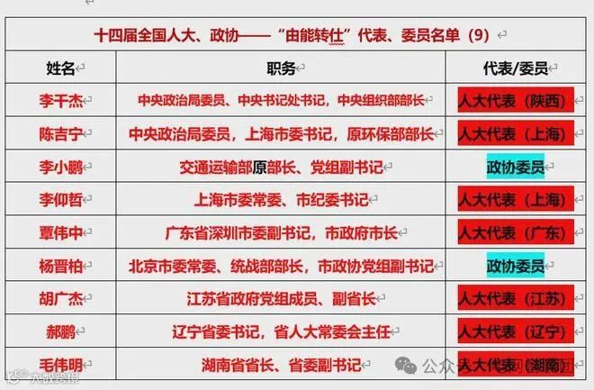 “由能转仕”的十四届全国人大代表、政协委员有9人,其中全国人大代表7人,政协委员2人。如中央政治局委员、中央书记处书记李干杰,曾任生态环境部部长、党组书记,中央政治局委员、上海市委书记陈吉宁曾任环保部部长,交通运输部原部长李小鹏曾任中国华能总经理,上海市委常委、纪委书记李仰哲曾任国家能源局副局长,深圳市长覃伟中曾任中国石油副总经理,辽宁省委书记郝鹏曾任国务院国资委主任,江苏省副省长胡广杰曾任中国海油副总经理,湖南省省长毛伟明曾任国家电网董事长。